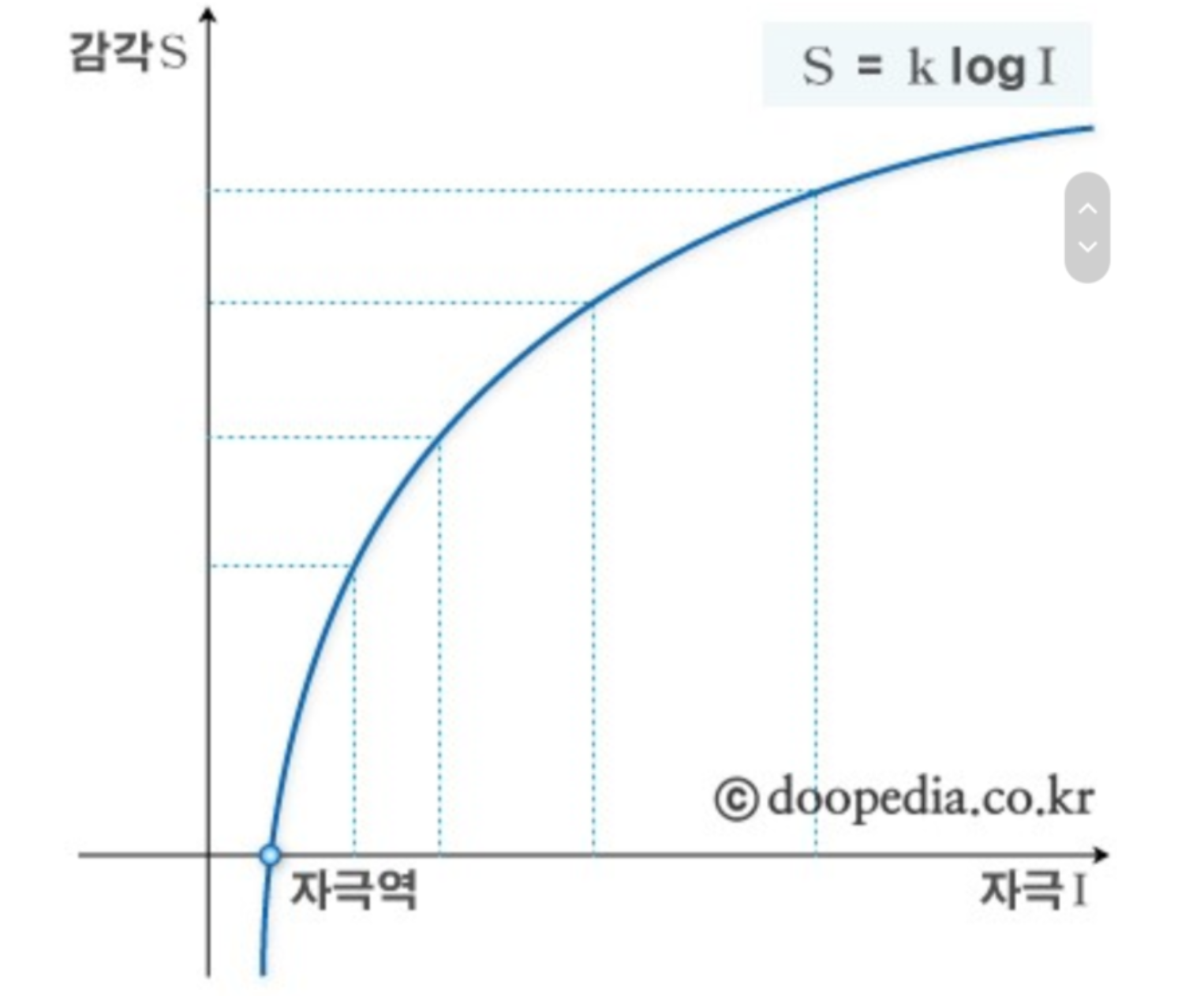 베버 - 폐히너 법칙 : 실제 물리적 자극 강도와 지각된 강도 사이의 관계는 로그 값에 비례함