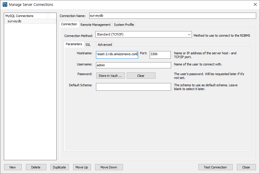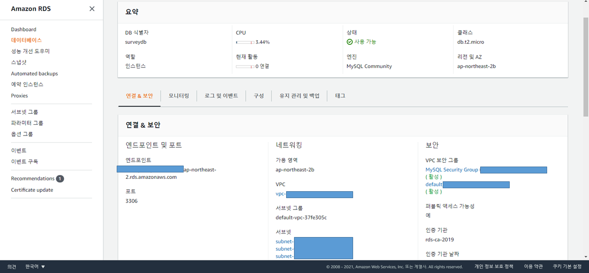 RDS DB생성 -> 암호설정 후 생성 -> 추가 보안그룹 생성 시 Workbench에서 연결할 Inbound 규칙( IP ) 설정