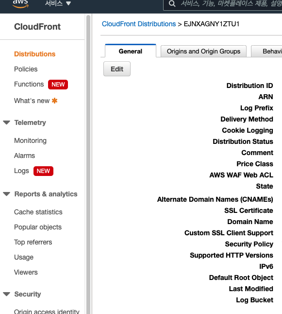 아래 CloudFront페이지에서 Generea Tab에 가서 Edit을 누르고