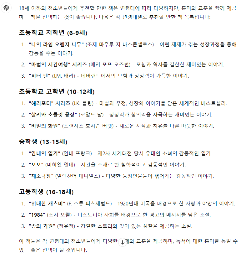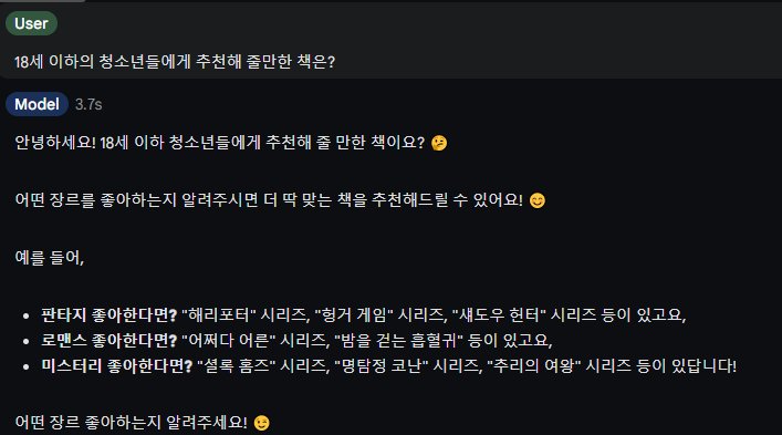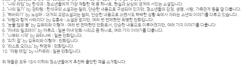 코렙에서 "18세 이하의 청소년들에게 추천해 줄만한 책은?" 이라는 질문으로 실행했을 때 4분 50초 정도에 수행 됐다;;