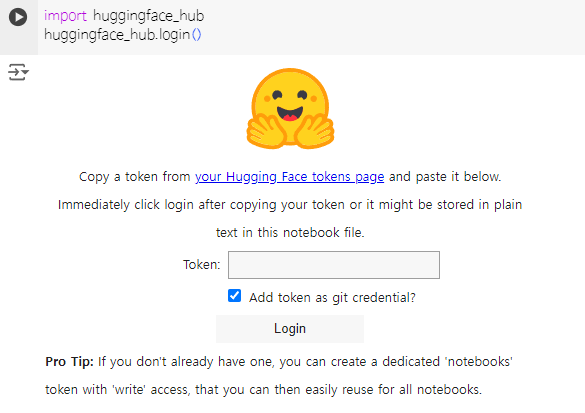 그리고 Colab 에서 아래처럼 입력하고 실행하면 위에서 생성한 Token을 입력해서 사용할 수 있다.